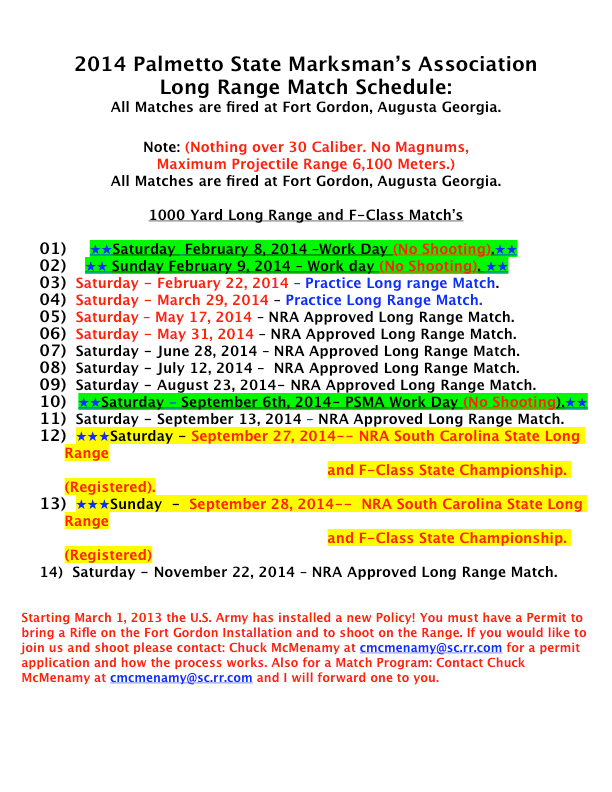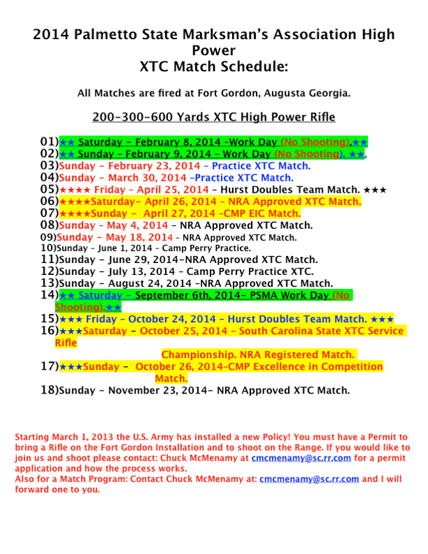 2014 Palmetto State Marksman's Assoc. Schedule