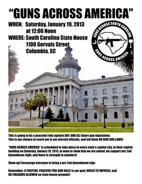 Columbia SC (January 19, 2013) – Local Second Amendment supporters in South Carolina will join forces for a national "Guns Across America" rally to be held at state capitals across the United States on Saturday, January 19, 2013 at 12:00 p.m. local time.